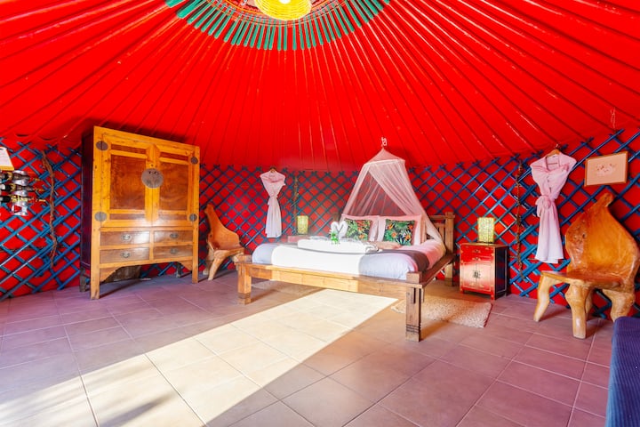 Eco Chiquitita蒙古包是一个环保的豪华双人蒙古包,由两个毗邻的正宗蒙古包、一个6米和3米的蒙古包组成,如果您与最多3名成人和2名儿童或婴幼儿的家庭一起旅行,这是一个绝佳的选择。