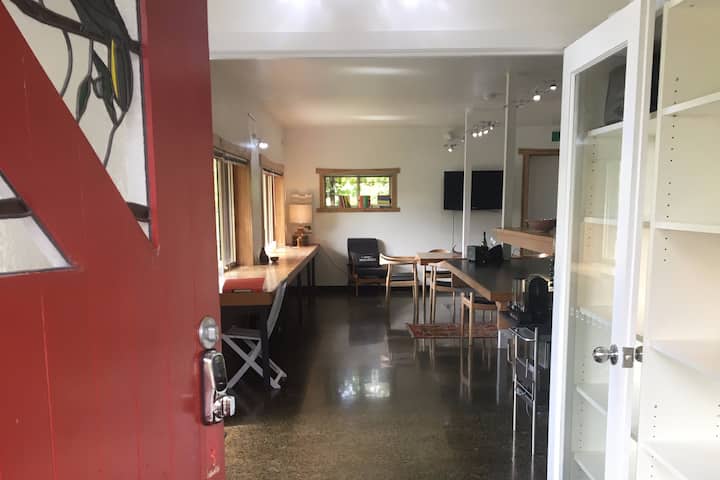 Trails End的楼上睡眠/休息区和楼下厨房/用餐区之间没有内部通道,可通过混凝土楼梯和房子一侧的露台通道进入。 楼下有抛光的混凝土地板,有一个略带工业风的咖啡厅,这里是厨房、餐厅、客厅和带淋浴的小卫生间。