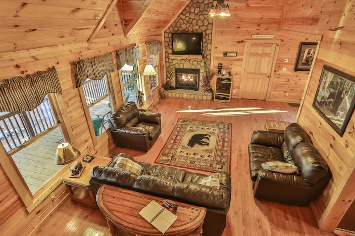 这间舒适的小木屋是一个充满乐趣的度假胜地,非常适合情侣、朋友或大家庭入住。 这间宽敞的5卧室🛏️小屋面积超过3,300平方英尺,设有大型停车场,可容纳12人,配备热水浴缸、大型环绕式甲板、🔥火坑、台球桌、空中曲棍球、桌上足球桌和带PlayStation和Wii游戏站的媒体室。 在Bearadise Lodge与家人和朋友一起度过特别假期,玩一场玉米洞游戏,或者放松身心,重新建立联系。