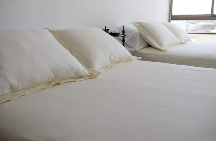 2 张约 1.35 米宽双人床、2张沙发床