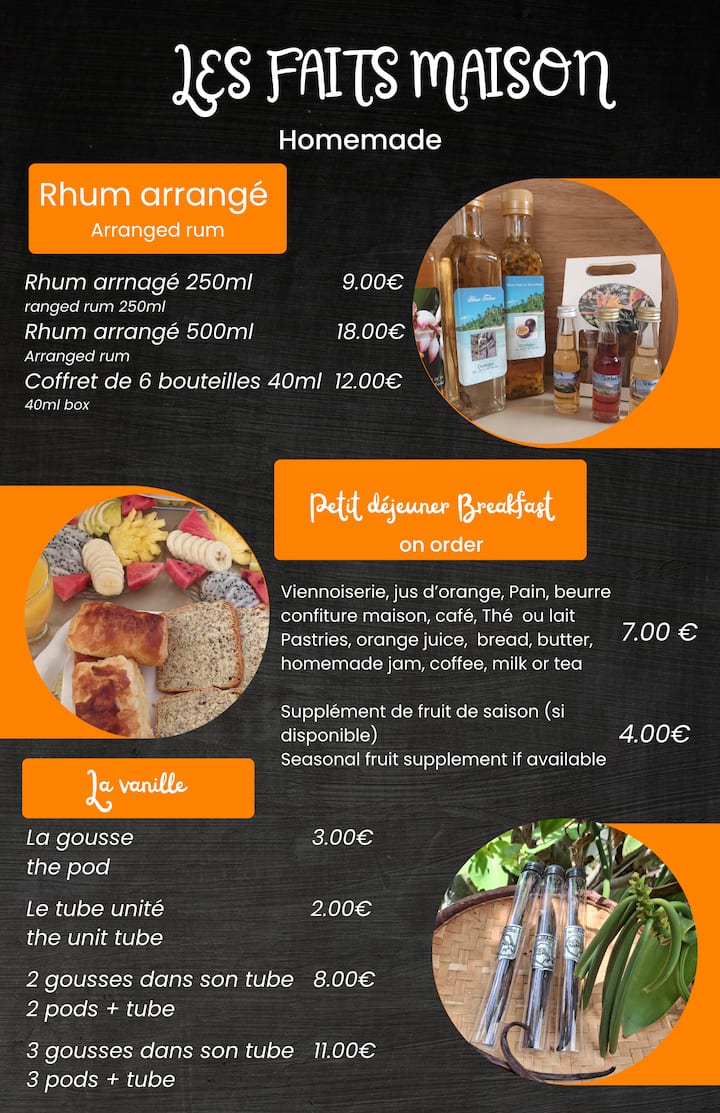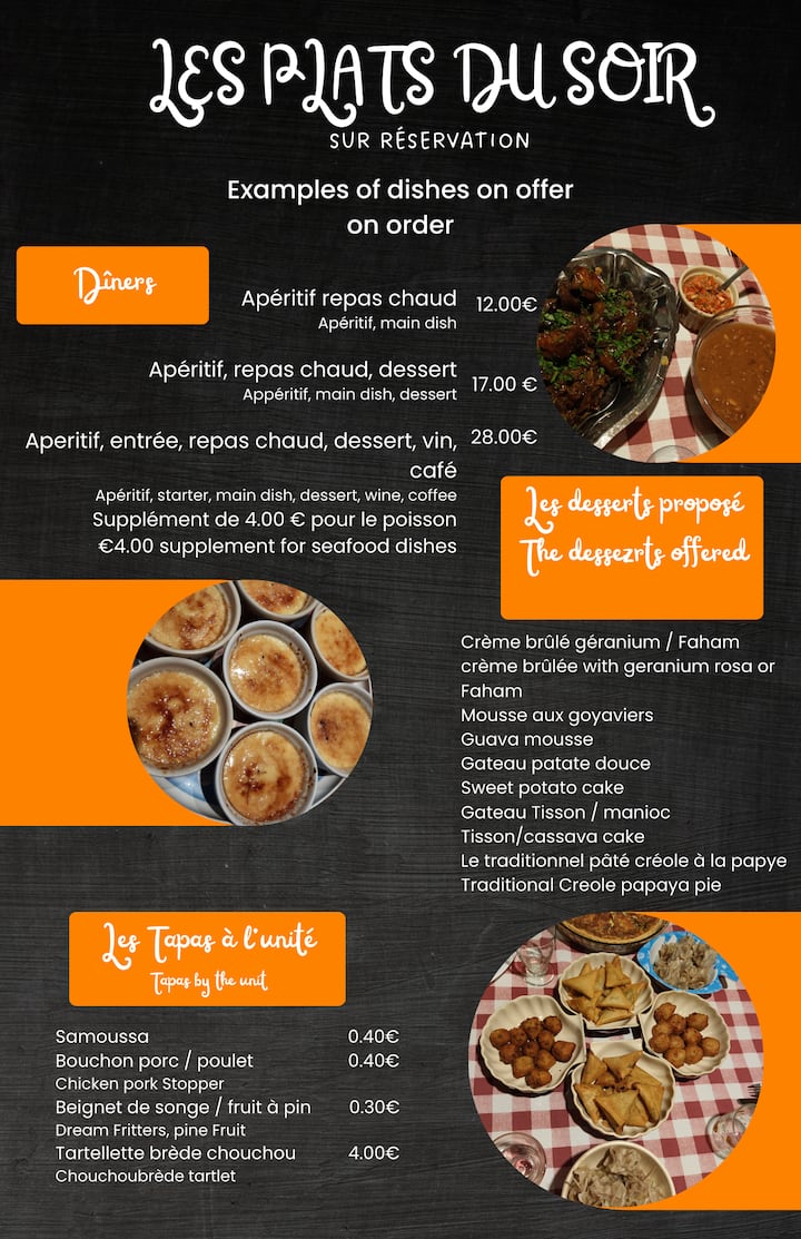 您将有机会探索一个花园,里面有多种果树,它们来自我们的岛屿,也来自其他国家。 我烹饪了很多克里奥尔美食,主要使用花园产品,您会惊讶于我们可以在克里奥尔花园里做些什么。 您喜欢探索,您很好奇,所以不要犹豫,我保证您不会对这次旅程失望。