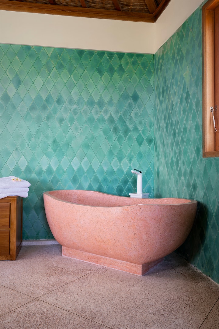 所有饰面和家具(如定制混凝土瓷砖、手工染制毯子和当地制造的陶瓷)均在巴厘岛定制或从工匠和木工那里采购。我很乐意与您分享我的珍藏!