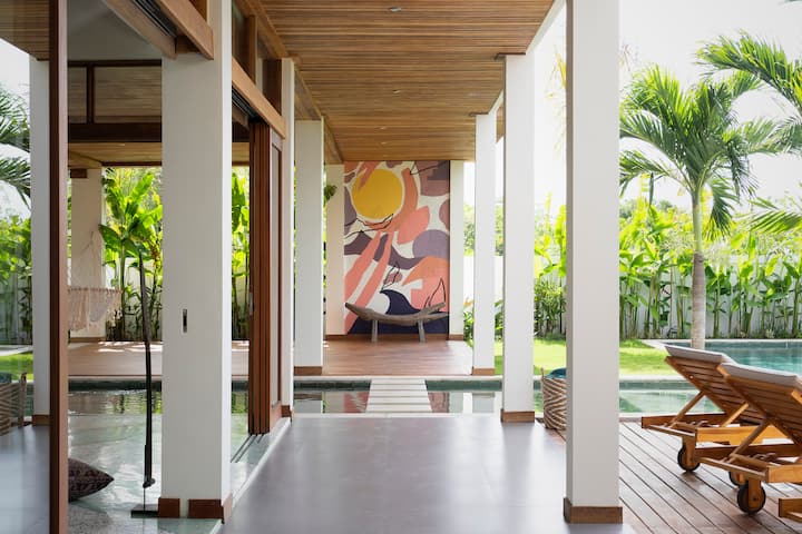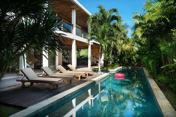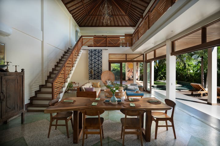 这间手工打造的度假别墅宽敞美丽,四周环绕着一堵隐私墙,营造出一片您难以舍离的绿洲。宽敞的开放式大房间、大餐桌和厨房,配备传统藤条支撑的拱形巴厘岛天花板、人字纹水磨石地板,通过二层的玻璃围栏可以看到花园中的红蜡棕榈。通往游泳池平台有一扇滑动玻璃门,带来明亮的光线。