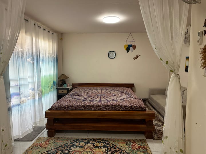 NAM JAI House家庭房(只接待女性) 一张大床两张单人床、独立卫生间和室外阳台。