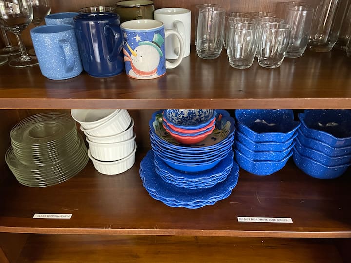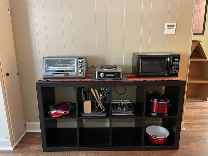 其他便利设施包括微波炉、咖啡机、茶壶、电炉、炖锅、烤面包机、空气炸锅、George Foreman室内烤架和带冷冻功能的公寓尺寸冰箱。 5加仑的罐装水冷却器里总是有新鲜的水。 我提供咖啡和茶包、奶油和糖/甜味剂。 当我在城里时,我会提供新鲜水果;否则,将提供速食燕麦片和麦片棒等清淡早餐。