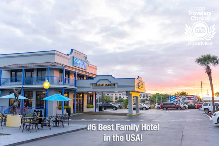 Celebration Suites被评为2020年排名第6的最佳家庭酒店! 每个房间都是独立的公寓,配有齐全的厨房,包括所有餐具,无需额外付费。