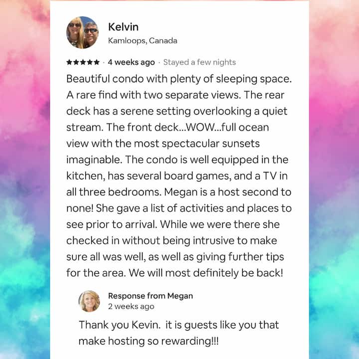 我认为,在美丽的华盛顿伯奇湾( Birch Bay )的公寓里接待家庭,这非常令人满意。 我喜欢帮助他们为家人创造回忆的空间。 因为我相信生活就是回忆!