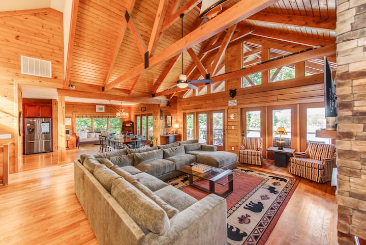 欢迎来到怀利湖小屋! 这座3卧室/3.5卫生间的海滨小木屋拥有180°的主通道景观、私人两层码头(可深入水域)、匹克球场(可转换为半场篮球或曲棍球)、两个火坑、大量聚会空间的甲板和星空下的水疗热水浴缸。 室内起居空间超过3,300平方英尺,露台可欣赏令人惊叹的景色,前门廊舒适,配有摇椅和门廊秋千,是一个放松、有趣的度假胜地!