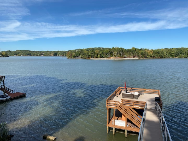欢迎来到怀利湖小屋,您的豪华怀利湖度假胜地,充满魅力! 这座3卧室/3.5卫生间的海滨小木屋拥有180°的主通道景观、私人两层码头(可通往深水区)、标准皮克球场(可转换为半场篮球或曲棍球场)、两个火坑、多个甲板(有大量的聚会空间)和一个水疗热水浴缸,可在星空下度过夜晚。 这栋房子的室内起居空间超过3,200平方英尺,有三间湖滨卧室,甲板上可欣赏令人惊叹的景观,前门廊舒适,配有摇椅和门廊秋千,专为放松和娱乐而设计。 这里距离夏洛特道格拉斯国际机场、夏洛特上城、美国银行体育场、白水中心和卡罗温德斯仅20分钟路程,是完美的城市度假胜地—靠近一切,但又远离尘嚣。 避开49号公路前往南卡罗来纳州的交通堵塞或前往诺曼湖的瓶颈;在这里,您可以快速前往市区,同时仍然在安静的死胡同上感到完全隐蔽。
