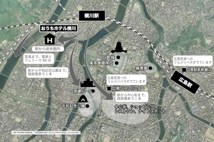 从广岛JR站和机场可轻松抵达我的所有客房,其中约30间,位于市中心附近或附近。