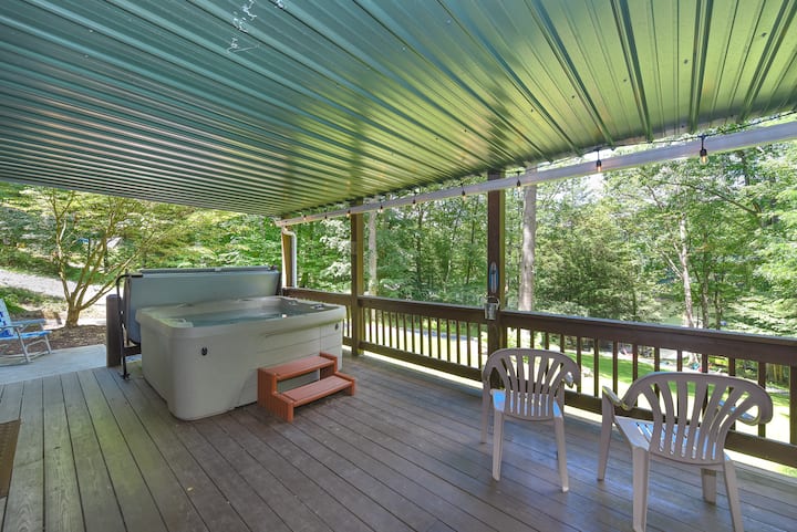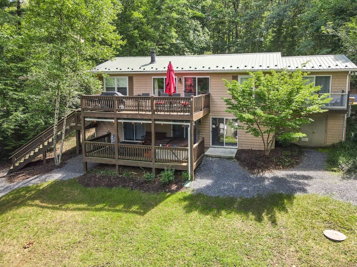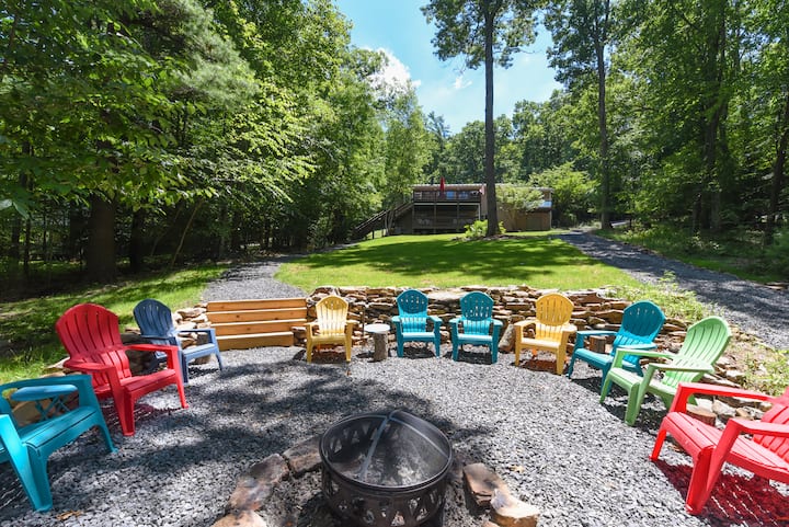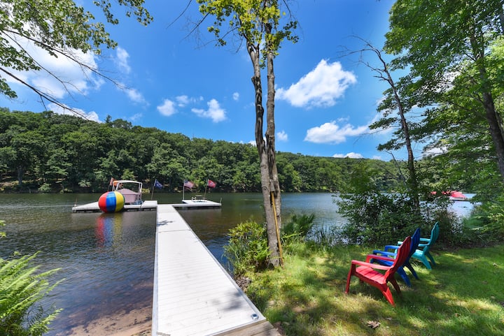 宁静的湖滨,带露台、码头和火坑
