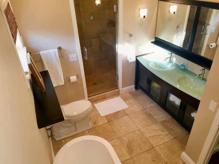 超级干净,提供免费毛巾、床上用品、洗发水、护发素、沐浴露和初学者k-cup咖啡。 私人停车场和入口,可通往私人露台,露台配备桌子、椅子和烤架。Roku智能电视。如有需要,可提供沙滩椅、沙滩毛巾和冷却器。