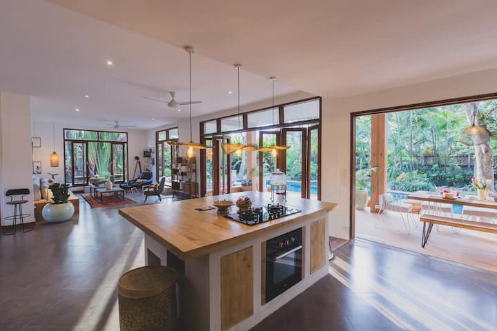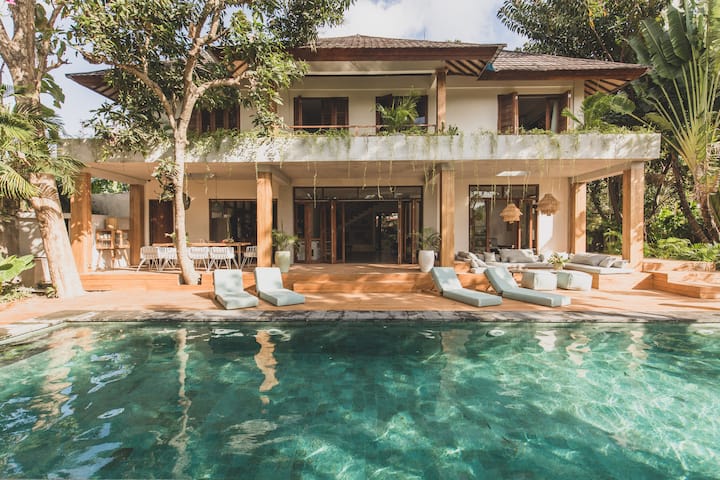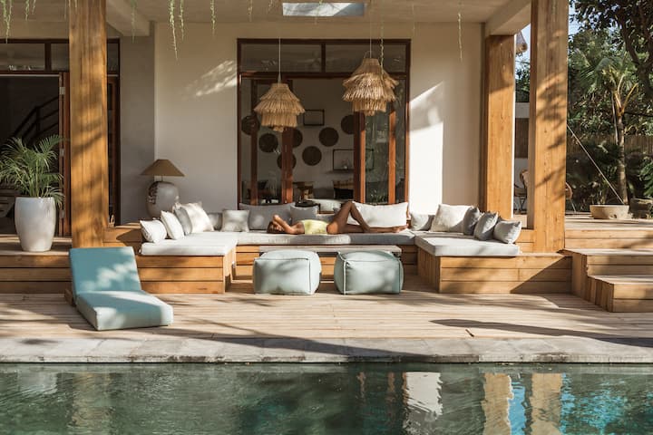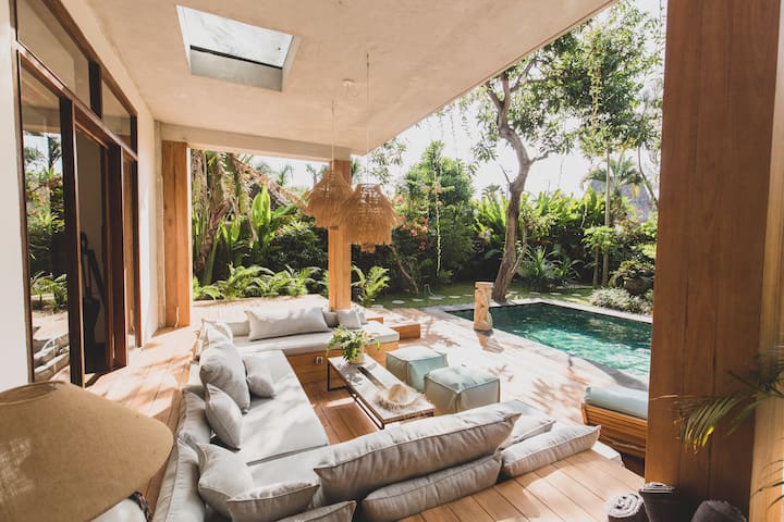 -一楼的客厅(室内和室外) :宽敞的房间,在郁郁葱葱的热带花园上开放,凉爽舒适。 玻璃滑动门让大量的自然光线进入泳池区域。 您可以整天在沙发上放松身心。 每个人都有足够的座位,您可以一起计划第二天的冒险,喝上一些饮料。