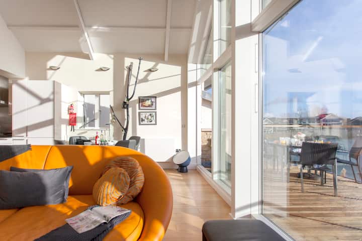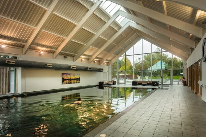 圆桌可容纳4人,可欣赏不间断的湖景,还有一张单独的偶尔方桌,可容纳2人。 坐落在一个明亮的角落沙发和脚凳上,位于起居区,在原木燃烧器(不提供原木)前营造一个舒适的放松场所,非常适合与亲朋好友坐在一起。 休息室配有大型液晶电视和DBD收音机,带有柔软的质地垫,为您提供最大的舒适体验。 起居区「溢出」到一个带吊椅的大阳台上,您可以在宁静的湖上露天用餐。