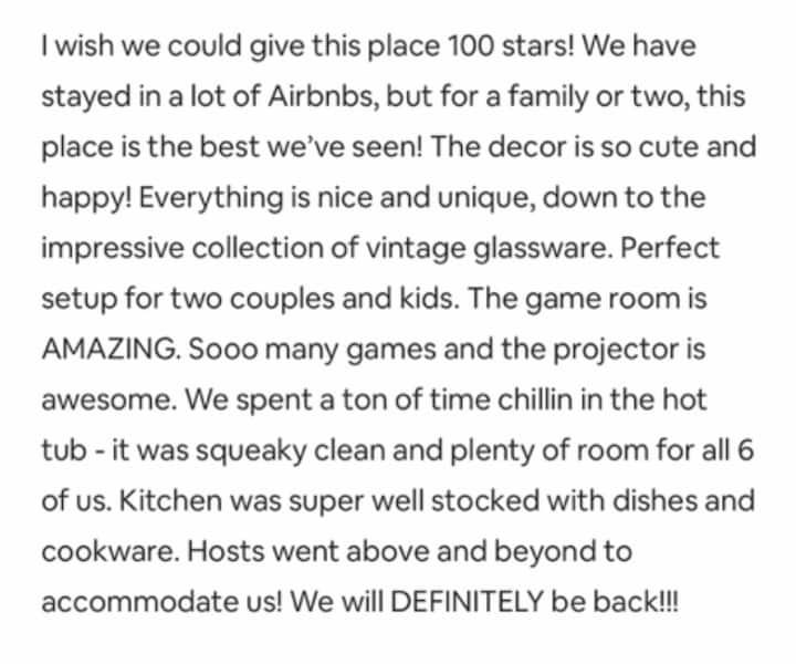 这是一个家庭住宅,它已经被用于很多家庭乐趣。 这里是您放松身心、享受快乐的地方。 我们为房客添加了一些升级,但它最初是一个真正的家庭的真正的家,我们的大家庭全年都在使用这个家。 在这个屋檐下,我们一起分享了很多欢笑、美好的回忆和温暖的拥抱,这正是我们希望继续分享的东西。 如果您想要一个原始、全新的房源,这不是。 如果您想要一个典型的、仿造的小屋,布满熊装饰,这绝对不是。 添置或更换物品时,我们会尽量寻找亮丽或有趣的款式! 如果您想要一个可靠的「家」来探索该地区,位于安静街区的便利位置,拥有舒适的住宿和大多数小屋业主不提供的许多额外服务,以及真正希望您度过愉快时光的当地业主,这里就是您的理想去处。