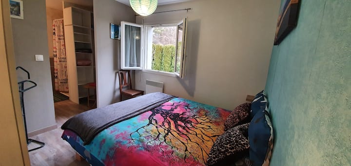 我的别墅位于安静的小区,配备了一个漂亮的厨房,有几个台面,可通往餐厅和客厅,客厅配有连接电视,卧室很舒适(新床上用品,可恢复睡眠)。 室外双露台面积60平方米,可欣赏泳池景观。