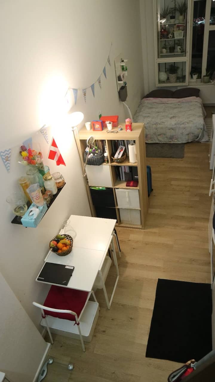 Fully furnished studio apartment (36m) with super high ceiling (make the main room so spacious). It is with double bed size, kitchen and equipment, bathroom including hot water, electricity, all inclusive. The apartment is in second floor which you can access with elevator.