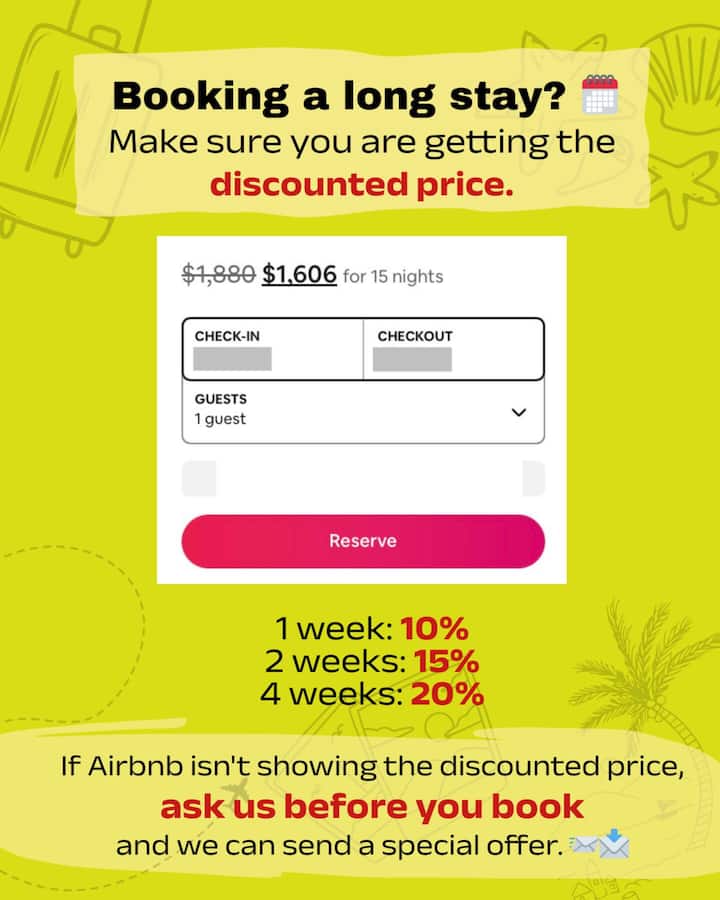 -沙滩装备:我们提供沙滩椅、沙滩毛巾和小型冷藏箱。 您可以在一些海滩租伞。 我们不提供浮潜装备。