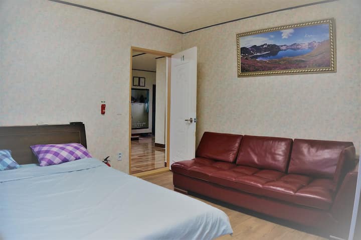 1 张约 1.8 米宽双人床、1张小型沙发床、1张地板床垫
