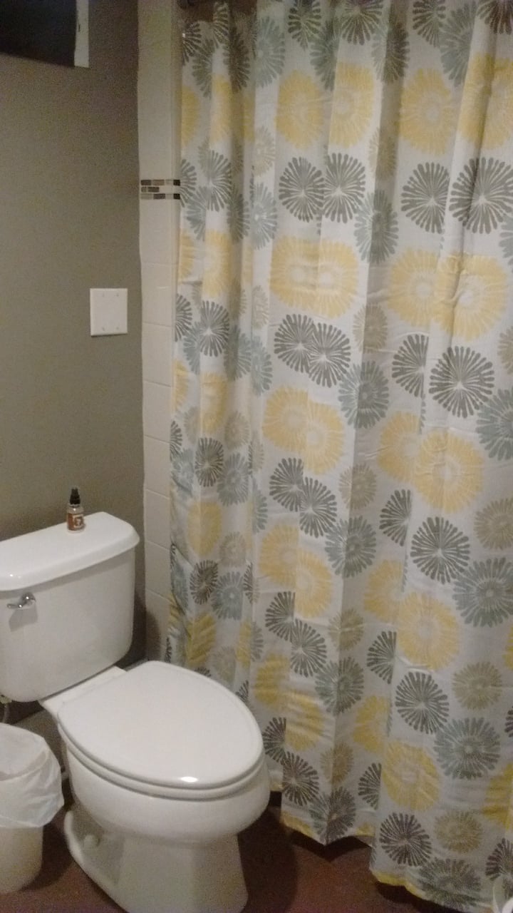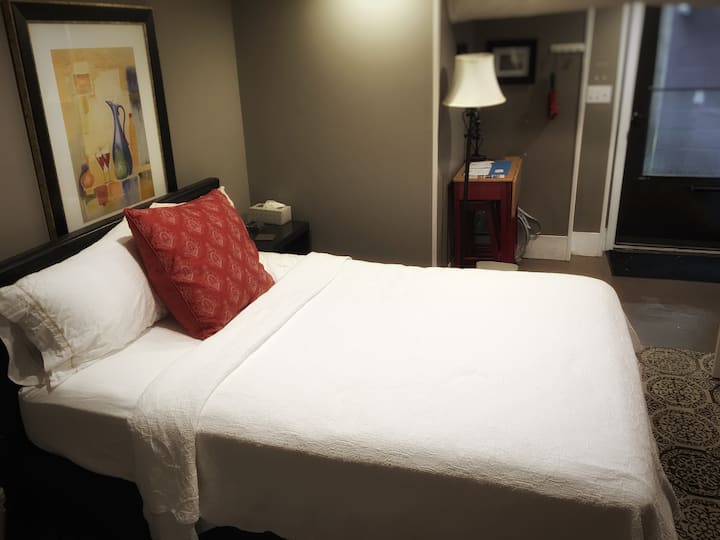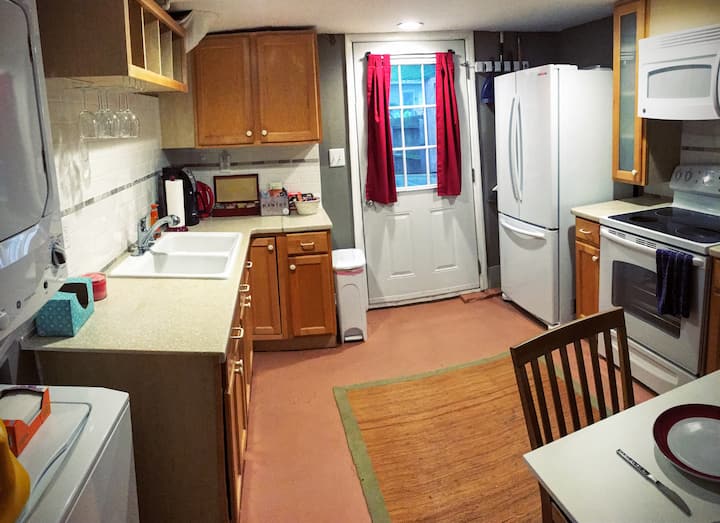 带围栏后院的地下室公寓。可以携带宠物。