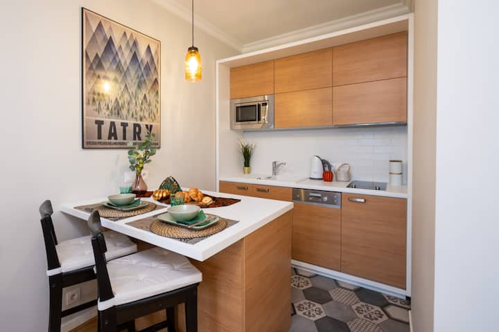 公寓位于市中心,非常靠近主要旅游景点和公共交通工具。 现代设计,注重舒适。 设备齐全的小厨房,配备微波炉、炉灶和洗碗机。 房客可享用碗碟、刀具和厨房用具。 公寓配有熨斗和烫衣板。 我们提供免费无线网络和卫星电视。 独立卫生间。舒适的大床。