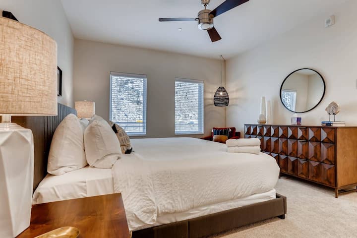 第二间卧室时尚现代,配有一张超棒的床和巨大的窗户。 地毯地板和柔和的落地灯将让您像地毯中的虫子一样舒适。走廊对面是一个精心设计的全功能卫生间,配备现代固定装置和浴缸/淋浴间。 站立或浸泡,任您挑选!卫生间旁边有堆叠式洗衣机和烘干机。