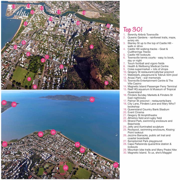 4.步行仅需20分钟(骑滑板车仅需10分钟,或短途车程)即可抵达磁岛渡轮码头。提前出发,乘坐20分钟的渡轮,您可以在一日游中轻松体验到Maggie的精华。我可以根据您的兴趣和健康状况定制行程-您可以尽情活跃或放松,有丛林小径通往僻静的海滩,在历史悠久的堡垒步道上几乎可以保证看到野生考拉,安全壮观的游泳点,在马蹄湾(Horseshoe Bay)有各种水上运动,还有很棒的咖啡馆、酒吧和餐厅,都很容易到达。