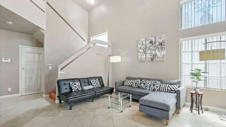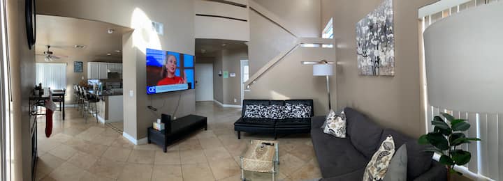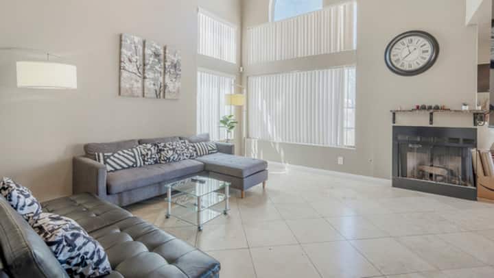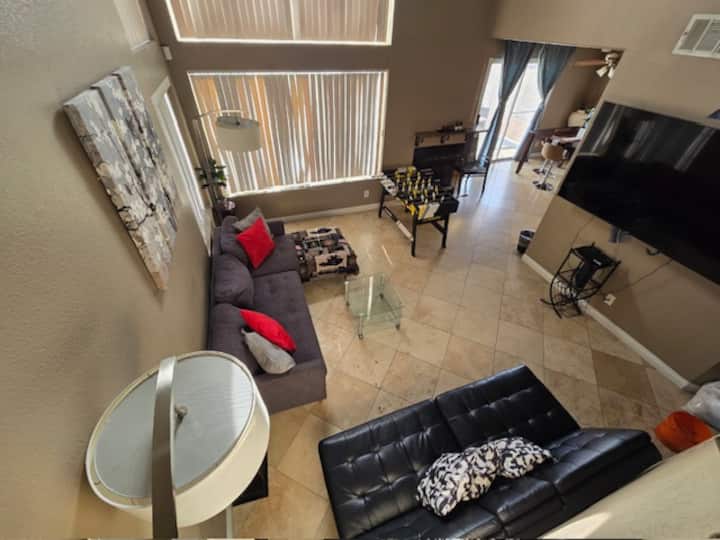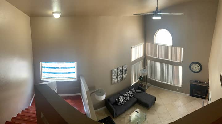 宽敞、舒适、安全,位于安静的街区。 明亮的开放空间和拱形天花板! 楼上的独立主卧配有他和她的水槽,走廊另一端有2间相邻的卧室。 所有卧室都配有新油漆,楼下走廊上有新木地板。 远离拉斯维加斯大道,但更接近隐藏的瑰宝-拉斯维加斯湖!