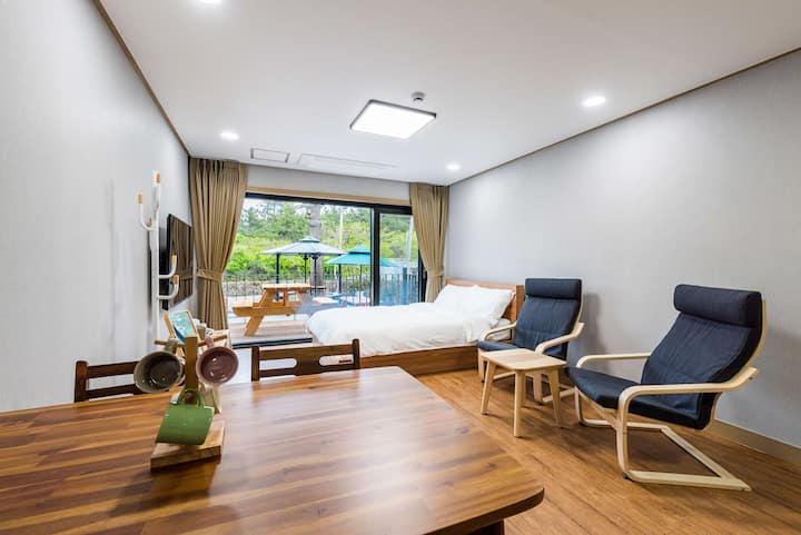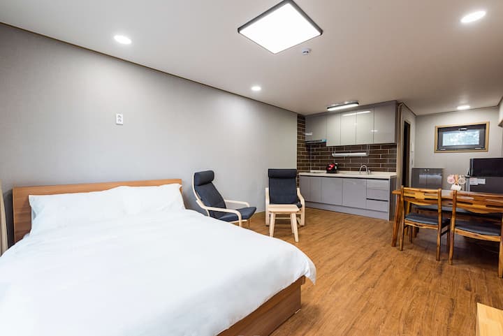 我是济州哈利姆( Jeju Hallim )一棵松树膳宿公寓的所有者。