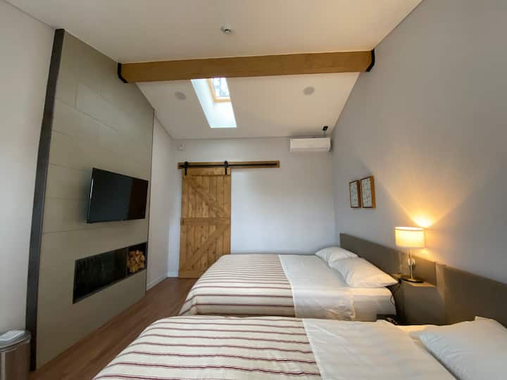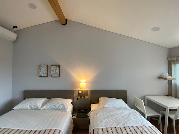 两间独立单间公寓可供两位成人入住,我们为您提供舒适的睡眠场所,配有双人床( Q + SS )的休闲睡眠区。 客房设有独立卧室、所有房间和卫生间,因此房间内有隐私。 所有房间均配有冰箱、微波炉、带电水壶的简单架子,卧室里有一张双人桌。 我们提供独立无线网络和Olleh电视服务,并提供马歇尔蓝牙扬声器。 房间外面有一个小型私人草坪和露台,可供私人度假屋使用。 花园的小门给您一栋私人别墅的感觉。