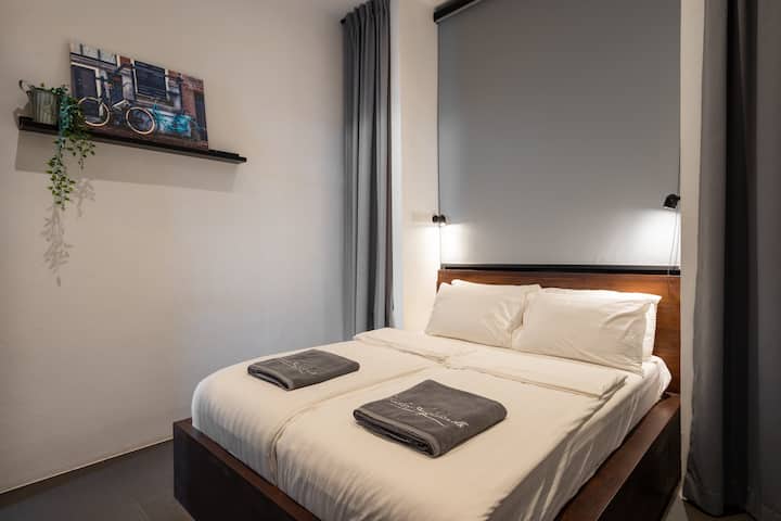 A9 Flexi House设有办公桌、办公椅和24英寸屏幕,非常适合数字游牧民。 公寓有一个工业设计的主题。 宜家的床垫,让您睡个好觉。 一间卧室和一间卫生间。