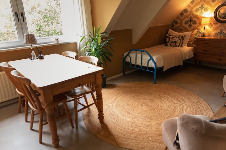 我和丈夫一起住在农场。 孩子们已经飞出去了,有我的梦想空间,有一个客房。 如果您正在寻找一个在Noordoostolder过夜的好去处,请感到宾至如归! 我提供单间公寓,不提供早餐,但可以咨询很多。 我喜欢舒适地在房间或花园温室提供节日早餐。