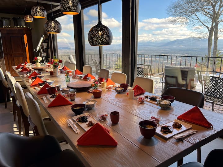开放式大客厅设有四面石壁炉、落地窗和滑动玻璃门,通往宽敞的阳台,可欣赏壮丽的山景。大餐桌是娱乐人士的梦想!