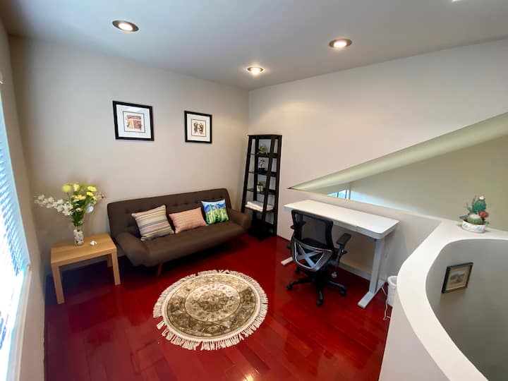 • 全新日式床垫沙发、架子、可调节的高度桌子,配备无线充电垫和USB端口,位于光线充足的凹痕办公室