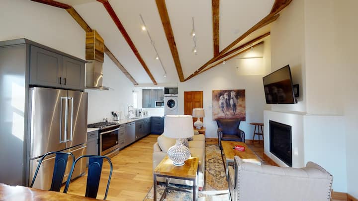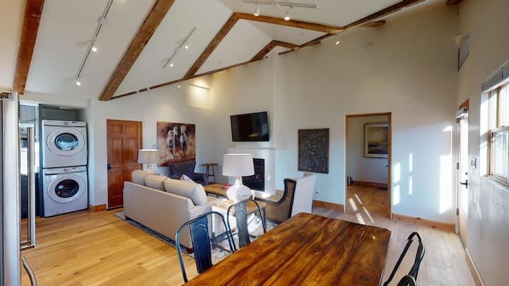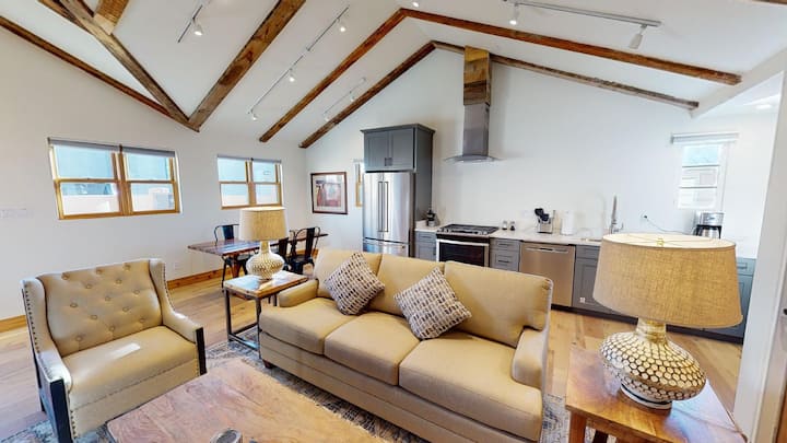 加大双人床、带燃气壁炉的舒适客厅、大浴室、带早餐区的设备齐全的厨房。 配备全套空调、无线网络、街外停车场、两台平板智能电视(Netflix、Hulu和Amazon Prime)、不锈钢家电和许多其他便利设施,让您在市中心度过美妙的假期!