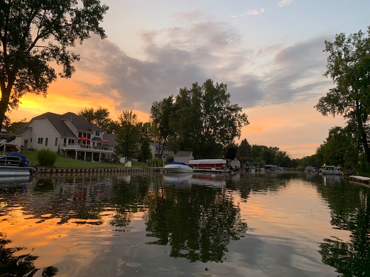 这栋房子位于一条9英尺深的运河上。可能会有意想不到的原木等。小心驾驶船只,慢慢查看该地区。该水道禁止唤醒。在前往湖泊的路上,您可以看到很多野生动物,如海狸、乌龟、鹤和鹿。如果您没有船,这个房源非常适合钓鱼、划皮划艇、划桨板或只是在露台/平台上看船只漂过。乘船5分钟或划皮划艇10分钟即可抵达开阔的水域。