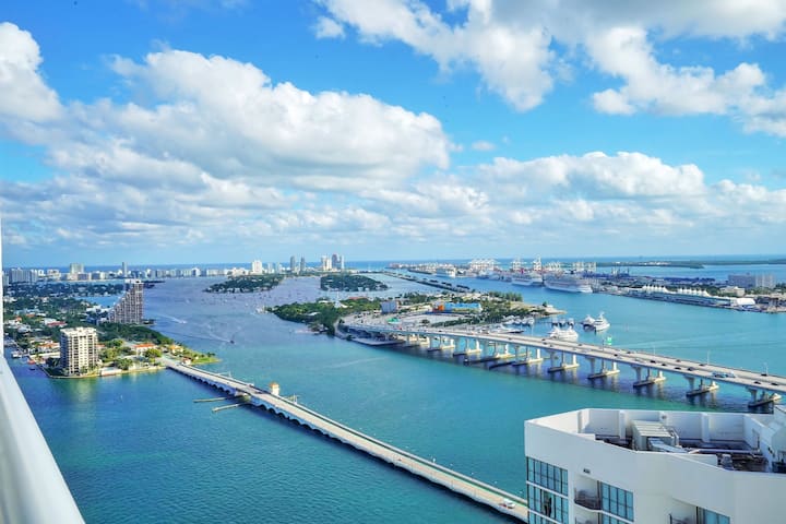 Sky High Penthouse位于42楼,设有1间卧室、1.5间全功能卫生间,可从私人阳台欣赏迈阿密市中心和比斯坎湾的壮丽景色。 这里有超过1200平方英尺的起居空间,是完美的度假胜地。 天空高顶层公寓!最多可住2名成人和儿童( 15岁及以下)。