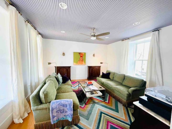 当您穿过前门时,右侧有楼梯,正前方是大厅,左侧是温馨的起居空间,可以与朋友一起娱乐。有四个大窗户和两张沙发,可供休息或享用饮料。光线令人陶醉,营造出与他人共享的美丽氛围。聆听黑胶唱片