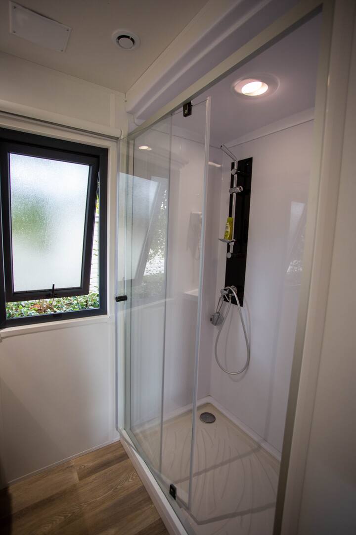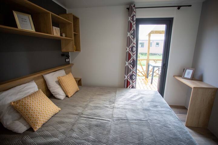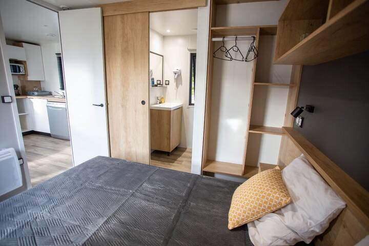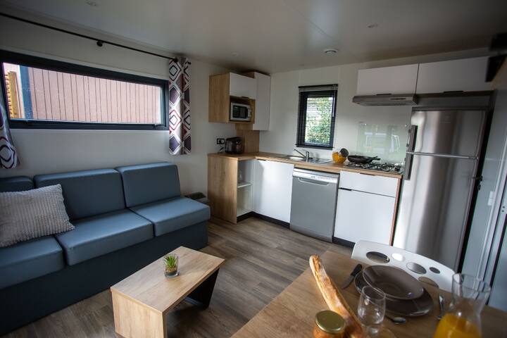 Mobil home premium 2 pièces pour 2 personnes, climatisé, de 22m² environ avec :
