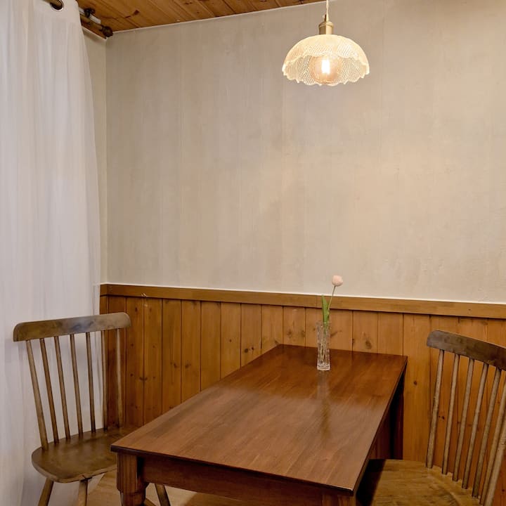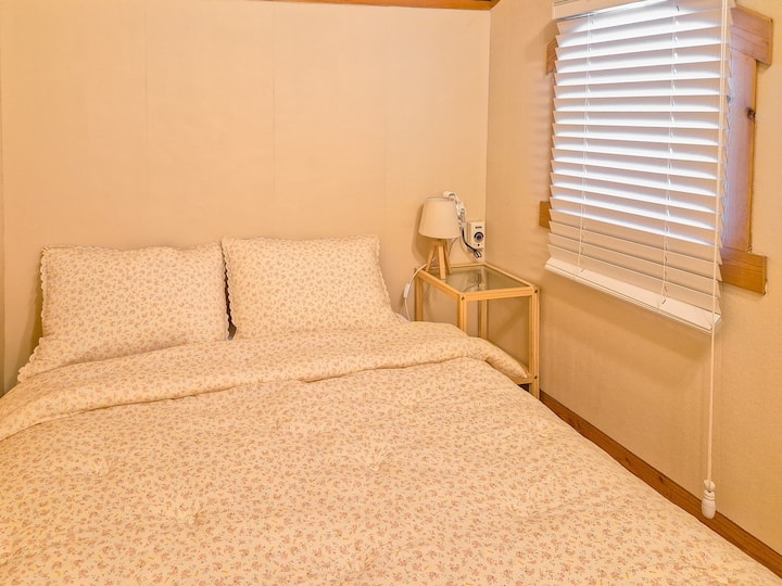 二楼有一张床,您可以使用卫生间、厨房、房间前面的独立烧烤设施,一楼有投影仪(可观看电视)。