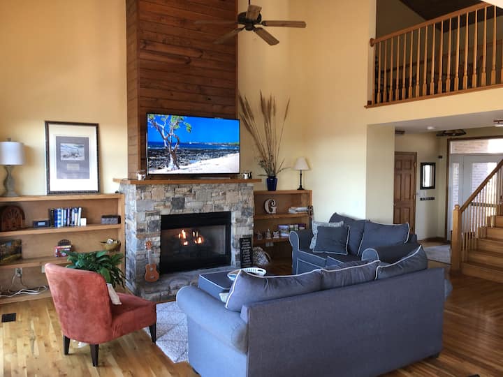 大客房是完美的聚会场所! 在门外欣赏壮丽的景色,玩游戏,玩拼图,或在舒适的火炉旁阅读书籍。 在燃气石壁炉上方,您可以享受65英寸智能电视(提供一些本地电视台,或使用您的登录信息登录到您最喜爱的应用程序-光纤互联网)。 用餐区通往大客厅和厨房,设有一张大餐桌,可容纳8人(可扩展),还有一间大酒吧,可容纳3人,配备电视!