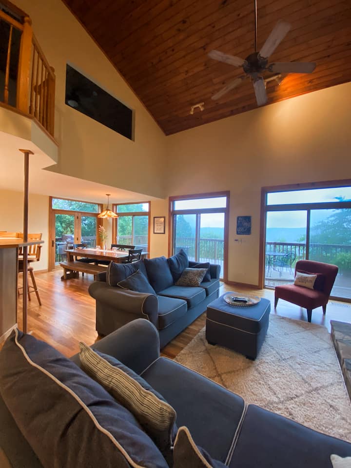 从大房间的四扇玻璃门进入宽敞的主甲板。 这里是清爽的完美场所……呼吸山间空气,在沙发上休息,或享用一杯葡萄酒和日落晚餐! 户外烹饪提供Weber燃气烤架。