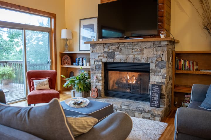 在Bear Cove的日落时分来这里放松身心,恢复活力!这是一座非凡的山地房源,设有4间卧室(1间阁楼)、2.5间浴室、开放式楼层,配有高耸的天花板、石壁炉、宽敞的露台、带热水浴缸的门廊、乒乓球和火坑!