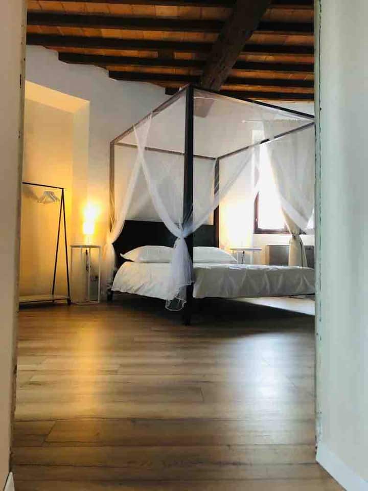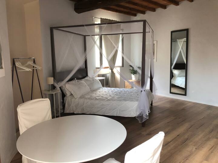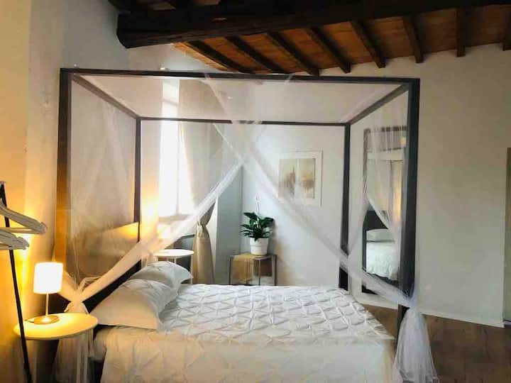 最私密的房间,只有窗户和砖砌壁炉,独享。 它有一张带架子的床,还有带裸露的复古横梁的赤陶天花板。 您可以从房间进入与Beatriceà房间共用的bisazza卫生间