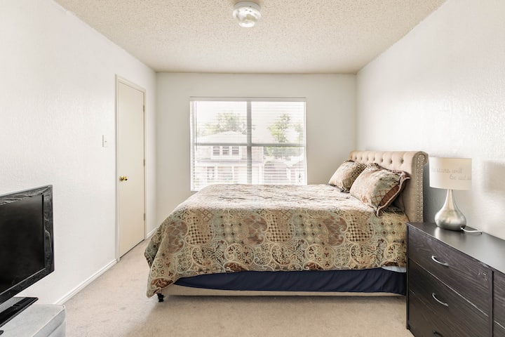 房源配备加大双人床和工作区,距离市中心15分钟车程