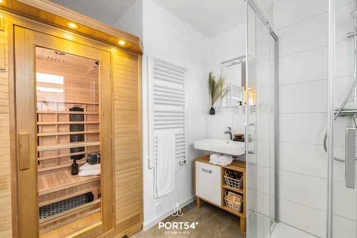 宽敞的卫生间配有步入式淋浴间、吹风机和毛巾烘干机。 在红外线桑拿房里,步行即可放松身心。