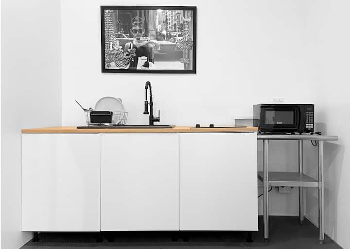 这间327平方英尺的现代客房单间公寓,天花板高度为11英尺,最多可免费停放2辆车,最近进行了全面翻新,配备了时尚的设计师家具。 客房设有绿色、阳光明媚的院子区域。 它位于历史悠久的好莱坞中心的一条绿色、安静和安全的住宅小街上,步行即可抵达著名的好莱坞景点、餐厅和俱乐部。 星光大道( Walk of Fame )、日落大道( Sunset Strip )、WeHo和鲁尼恩峡谷( Runyon Canyon )就在附近。 客房设有独立的钥匙入口,没有共用空间。 设有全功能独立卫生间、厨房区域(带小厨房、大冰箱、电动双炊具、水槽、微波炉)、全新非中央独立空调、可收看388个频道的50英寸HDMI平板有线电视、快速无线网络、带6英寸记忆泡沫床垫的标准双人床、爱沙发、边桌、咖啡桌、大桌子/桌子和全尺寸镜子。 单间公寓浴室设有带Hansgrohe淋浴头的淋浴间、Duravit壁挂式马桶和带Hansgrohe水龙头的Duravit水槽。 包括新鲜的100%棉床上用品、羽绒被、两个枕头、浴巾/擦手巾、洗手液、一体式沐浴露、洗发水和护发素、卫生纸( 2R )、吹风机、熨斗和熨衣板。 包括主厨房用具,可根据房客的要求添加。 客房单间公寓正在进行专业清洁,包括床上用品/毛巾消毒。