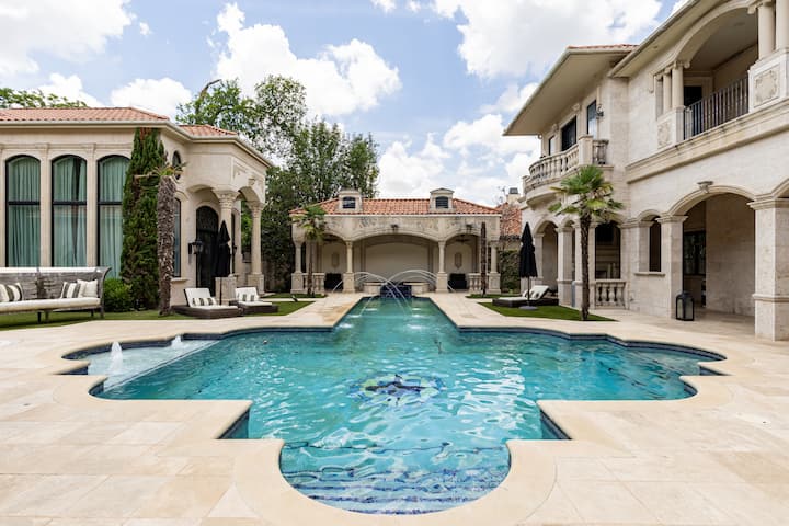 我们有一个非常适合娱乐的大房子。 后院,周围有泳池、按摩浴缸、烧烤设施和美丽的建筑。