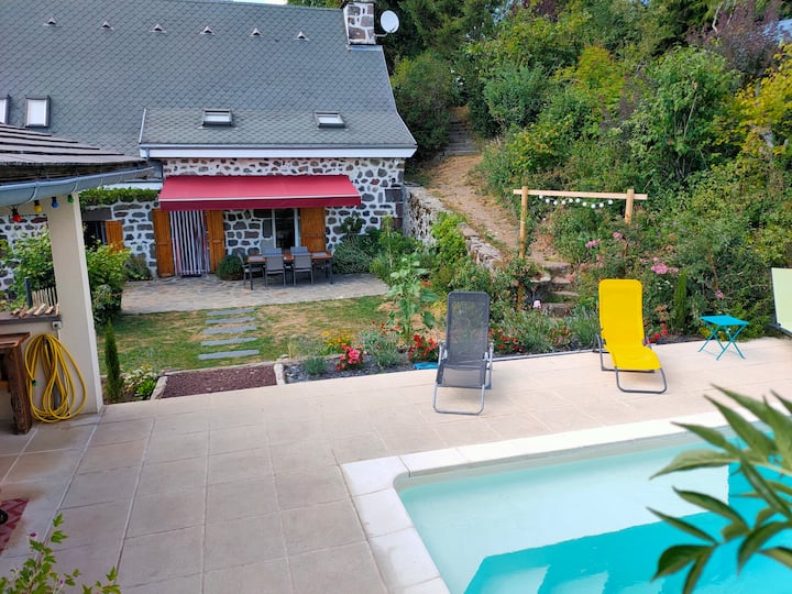在大自然中,在一个保留的环境中,享受一个放松的假期,这里是Estelou Cosy,一座美丽的传统房屋,坐落在Cantal,在夏季的山脚下,拥有葱郁的花园和私人游泳池。