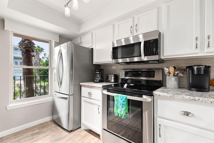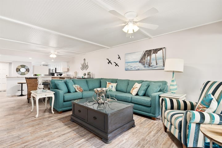 实际上是海滨,没有价格标签。 地理位置非常好,步行即可抵达任何地方。 新装修的2卧/2卫公寓。 主卧配有一张加大双人床和独立卫生间。 客卧配有一张标准双人床和一张定制的双层床(加大单人床/加大单人床),并有一个邻近的卫生间。 这套公寓可舒适入住8人。 请勿携带春假团体,请勿携带宠物。 请阅读我们的入住须知中的所有要求。